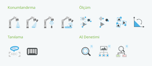Yapay zeka destekli işbirlikçi robotlar, görsel incelemeler ve dinamik alma ve yerleştirme görevleri gerçekleştirmek için ortamlarının ve parçalarının varlığını ve yönelimini tanır. Yapay zekayı üretim hattına zahmetsizce uygulayın ve üretkenliği artırın, maliyetleri düşürün ve çevrim sürelerini kısaltın. Yapay zeka görüşü ayrıca makinelerden veya test ekipmanlarından sonuçları okuyabilir ve buna göre uygun kararlar verebilir.